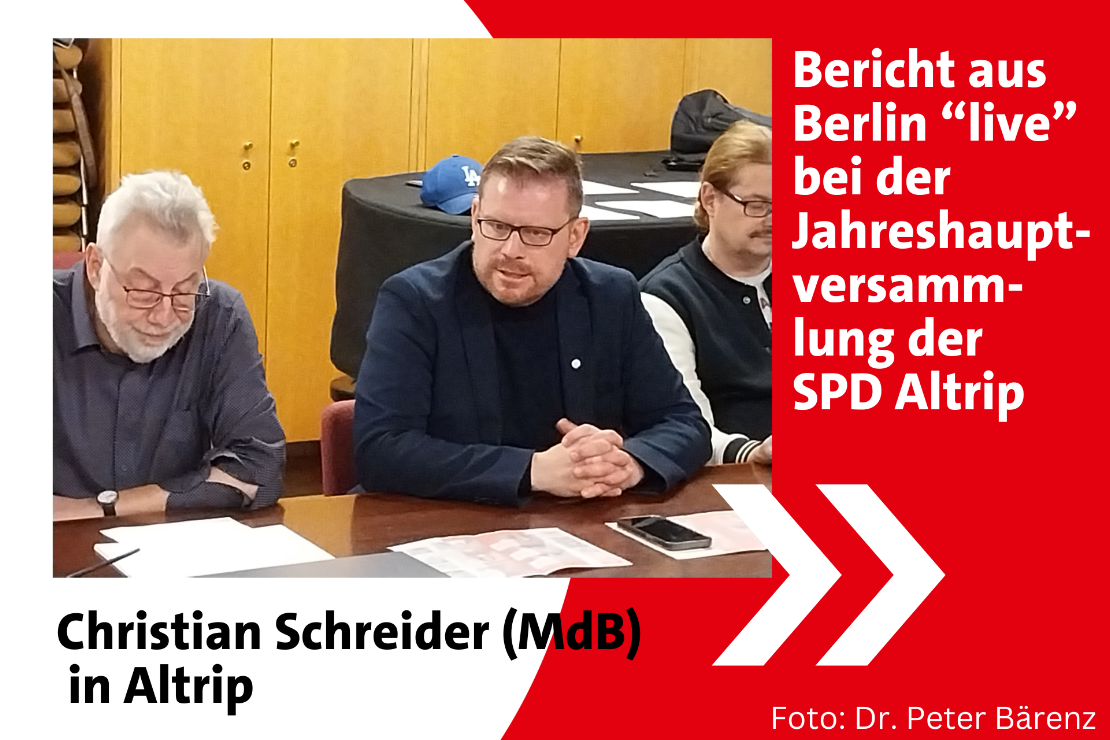 Bei der diesjährigen Jahreshauptversammlung der SPD Altrip am 27. Februar 2024 begrüßte unser Co-Vorsitzender Hans-Peter Kaub unseren im Wahlkreis Ludwigshafen/Frankenthal direkt gewählten Bundestagsabgeordneten Christian Schreider.