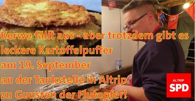Die Kerwe fällt leider wegen Corona in diesem Jahr in Altrip aus.  Aber trotzdem gibt es am Sonntag, den 19. September(Kerwesonntag) von 11.00 Uhr bis etwa 18.30 Uhr die traditionellen leckeren SPD Kartoffelpuffer(Grumbeerpannekuchen) an der ARAL Tankstelle in Altrip‼  Die eigene Küche kann kalt bleiben. Die Portion kostet 4,50€. Der Erlös wird vollständig an die Flutopfer gespendet.