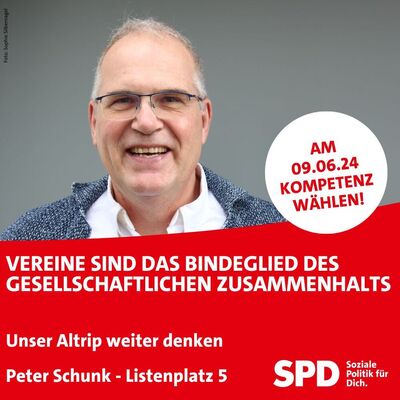 In Altrip sind 5600 Menschen in Vereinen organisiert, davon sind über 1000 Jugendliche. Für Peter Schunk geht es nicht nur um die speziellen Angebote, für ihn bedeutet das Vereinsleben viel mehr: „Vereine sind das Bindeglied des gesellschaftlichen Zusammenhalts“. Als Vorsitzender des größten Vereins kennt er genau die Sorgen und Nöte eines Vereins. Für ihn ist klar: „Trotz angespannter Haushaltslage müssen die Vereine auch in Zukunft finanziell unterstützt werden. Er sorgt dafür, dass im Gemeinderat die Interessen der Vereine gehört werden.